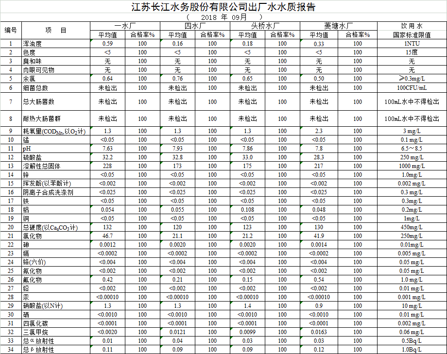 自來水水質(zhì)報(bào)告(2018年9月份)