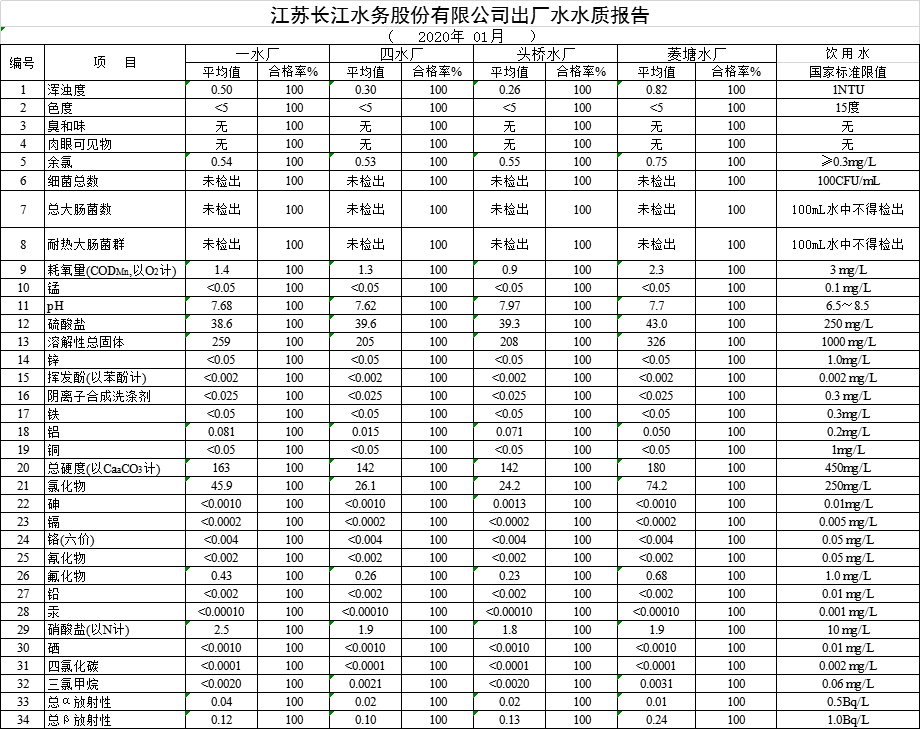 自來(lái)水水質(zhì)報(bào)告(2020年1月份)