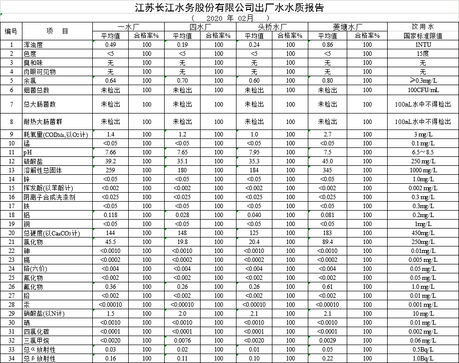 自來水水質(zhì)報(bào)告(2020年2月份)