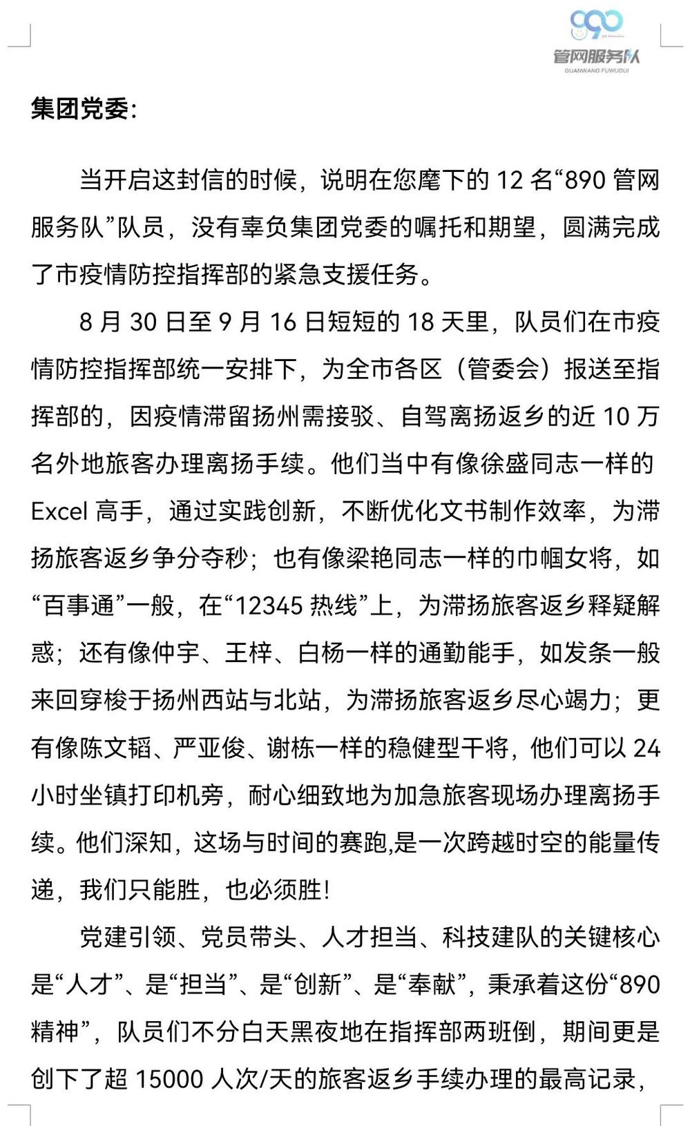 志愿服務(wù)工作結(jié)束后,這12名敬業(yè)而又可愛(ài)的志愿者將18天來(lái)工作的點(diǎn)點(diǎn)滴滴匯聚成了一封匯報(bào)信,向集團(tuán)黨委匯報(bào)他們不辱使命,用實(shí)際行動(dòng)踐行了“守城衛(wèi)家、城控有我”的鏗鏘誓言,并請(qǐng)集團(tuán)黨委放心,他們將把抗疫精神繼續(xù)延續(xù)到今后的工作中,讓890管網(wǎng)服務(wù)隊(duì)成為民生服務(wù)的金字招牌。
