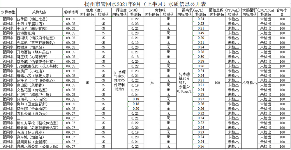 揚州市管網(wǎng)水2021年9月(上半月)水質(zhì)信息公開表