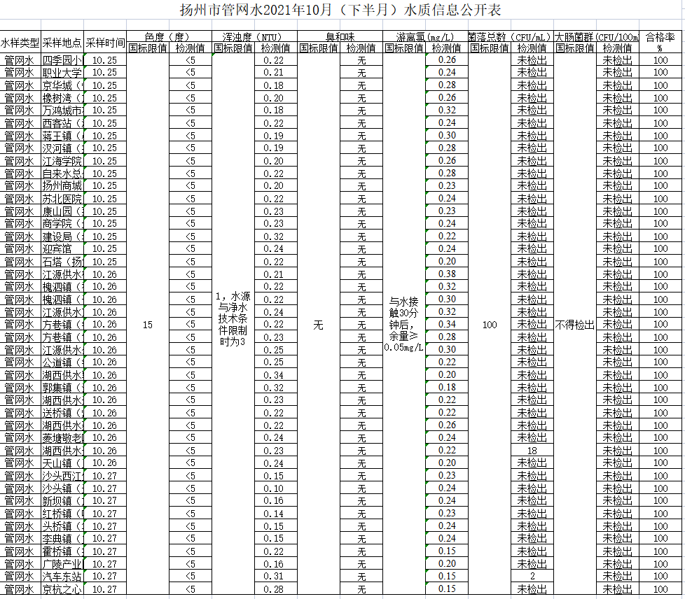 揚(yáng)州市管網(wǎng)水2021年10月(下半月)水質(zhì)信息公開(kāi)表
