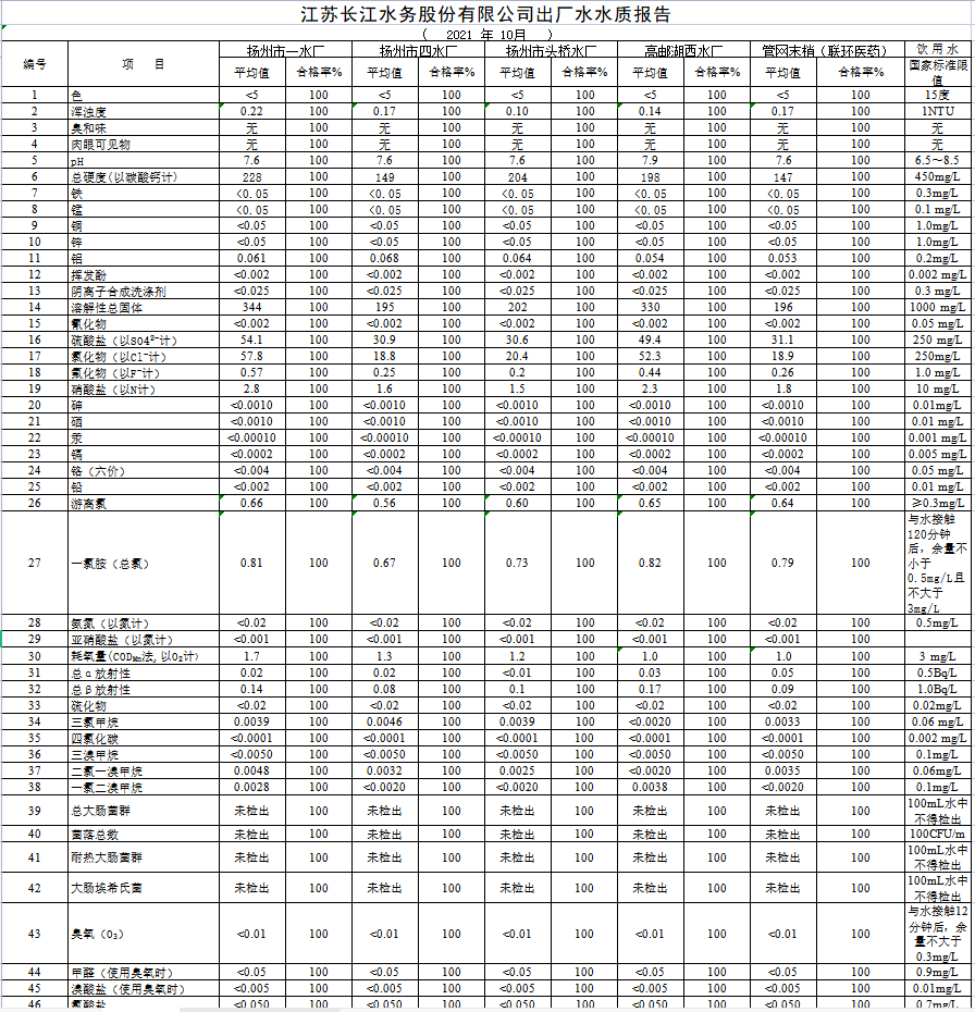 江蘇長(zhǎng)江水務(wù)股份有限公司出廠水水質(zhì)報(bào)告 (2021 年 10月)