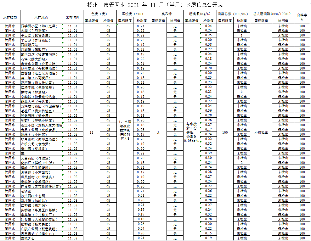 揚州市管網(wǎng)水 2021 年 11 月(半月)水質(zhì)信息公開表