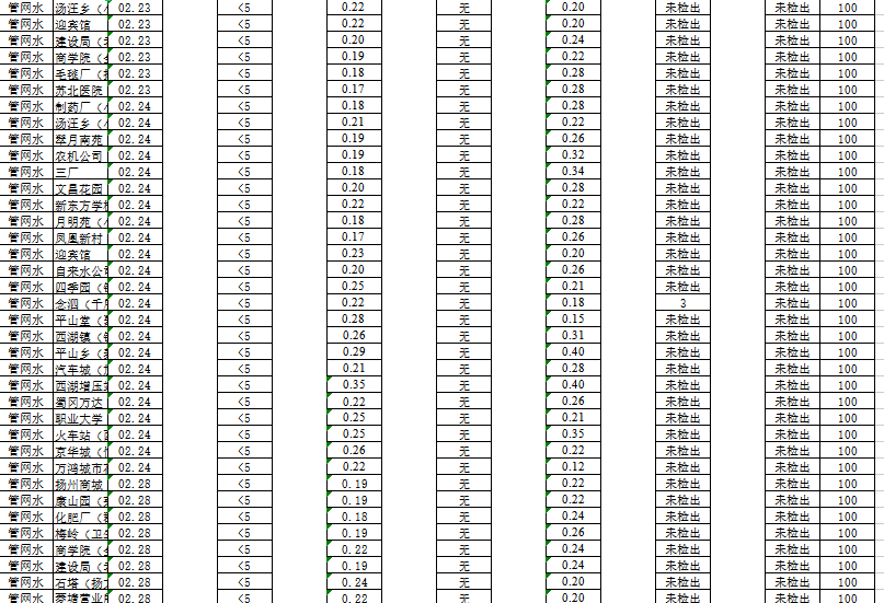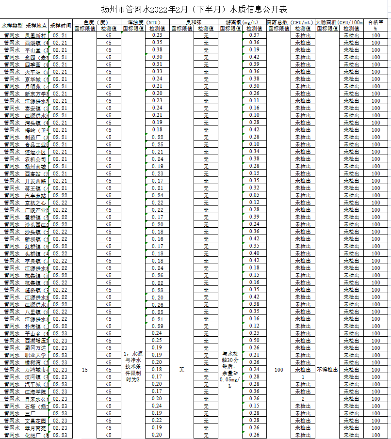 揚州市管網(wǎng)水2022年2月(下半月)水質信息公開表