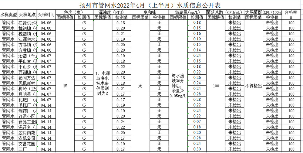 揚州市管網(wǎng)水2022年4月(上半月)水質(zhì)信息公開表