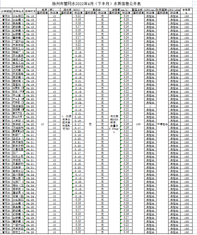 揚州市管網水2022年4月(下半月)水質信息公開表