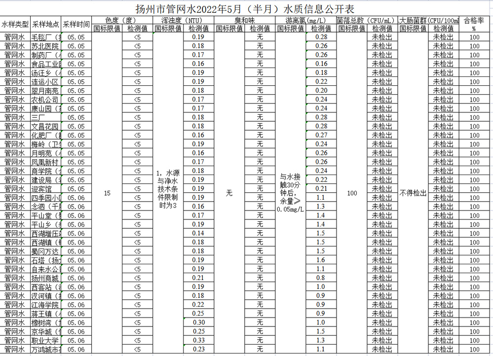 揚(yáng)州市管網(wǎng)水2022年5月(半月)水質(zhì)信息公開表