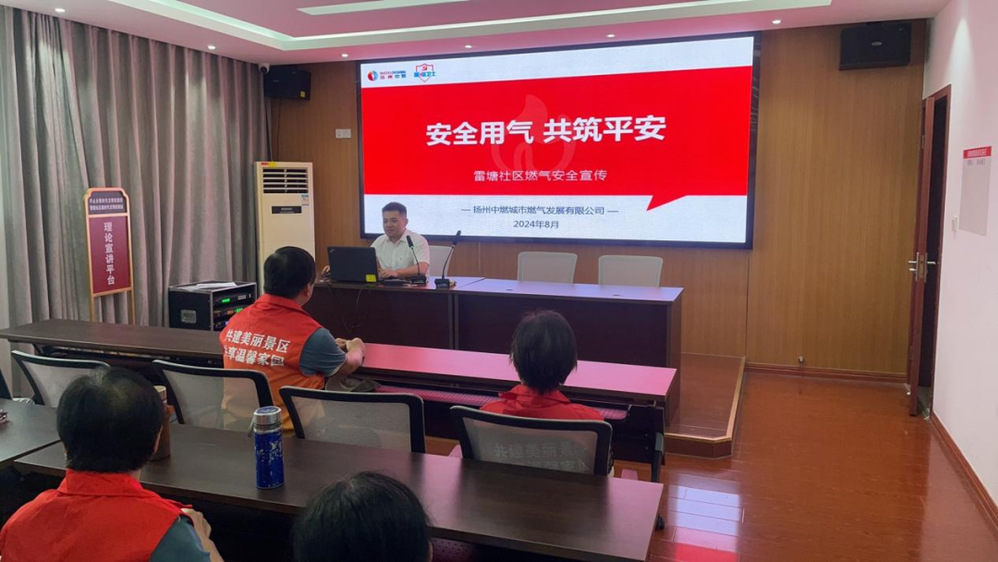 在社區(qū)會(huì)議室,揚(yáng)州中燃“藍(lán)焰”志愿者還為即將使用天然氣的莊臺居民,帶去了一場燃?xì)獍踩褂弥黝}講座,對燃?xì)獍踩WR、夏季安全用氣注意事項(xiàng)、燃?xì)馐鹿试蚍治龅冗M(jìn)行了詳細(xì)的講解。
