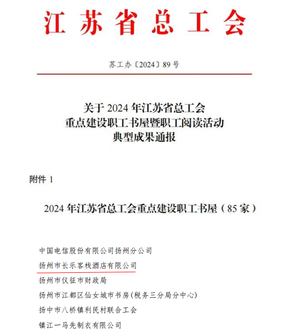 近日,江蘇省總工會(huì)發(fā)布重點(diǎn)建設(shè)職工書屋暨職工閱讀活動(dòng)典型成果通報(bào),揚(yáng)州市長(zhǎng)樂客棧酒店榮獲“2024年江蘇省總工會(huì)重點(diǎn)建設(shè)職工書屋”稱號(hào)。