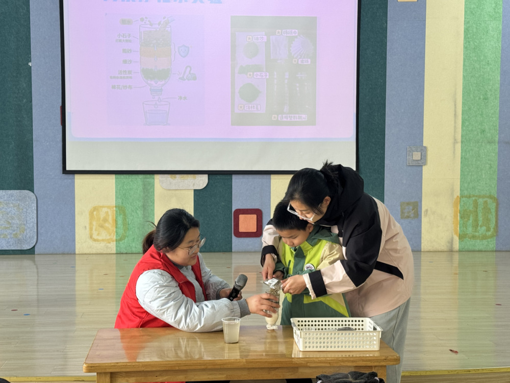 隨后的凈水實驗將活動推向高潮。吳隊長與老師協(xié)作,準(zhǔn)備渾濁水樣、紗布、活性炭、燒杯等器材,分步演示過濾、吸附、凈化全過程。孩子們圍在實驗臺旁,睜著好奇的眼睛觀察水質(zhì)變化,不時發(fā)出驚嘆。志愿者耐心解答孩子疑問,讓他們直觀明白凈水原理,深刻體會水資源珍貴。此次課堂以“趣味科普+實操體驗”為特色,把節(jié)水護(hù)水種子播進(jìn)孩子心里,為節(jié)水理念傳承筑牢根基。
